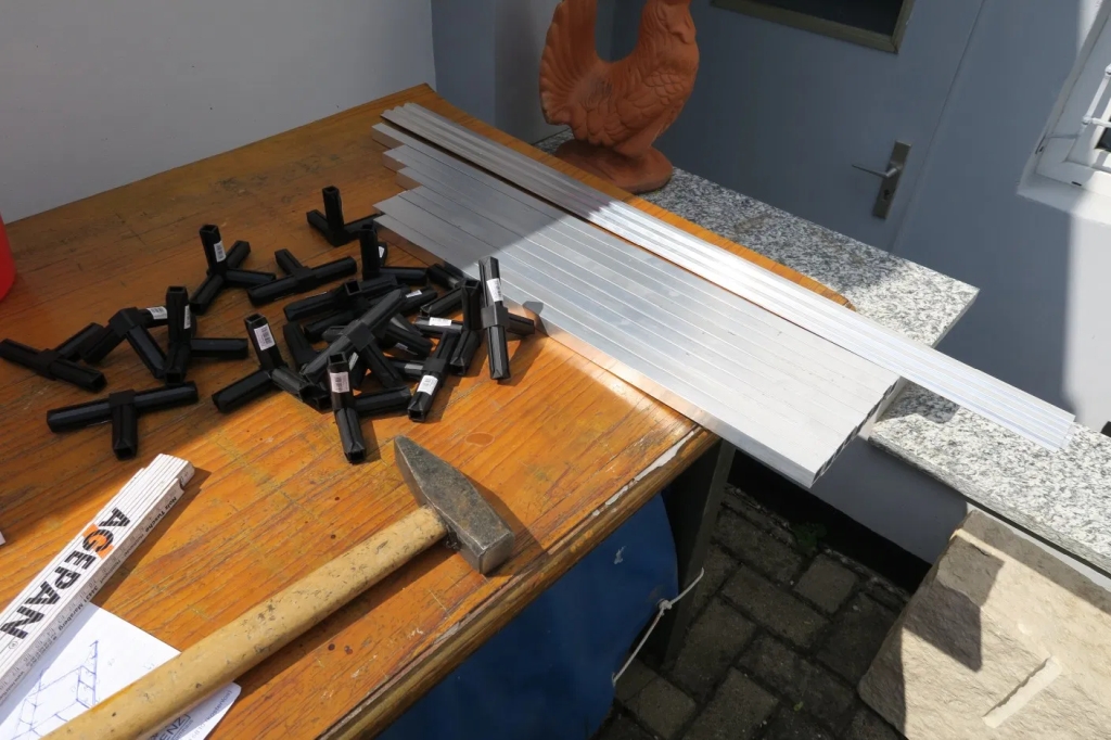 Auf dem Tisch liegt das Einzelmaterial für den Gepäckträger. Bald kommen die Fotos des fertigen Hängers.