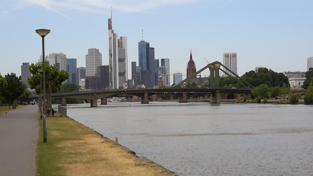 Heute geht es durch Frankfurt aber wir fahren viel am Main entlang. Ich schreibe deshalb schon, weil mir die Telekom gemeldet hat – das High Speed Datenvolumen des Telefons ist zu 90% aufgebraucht und hier gibt es bei Anna noch WLAN. Bald müssen wir also wirklich auf einen kostenlosen WLAN Zugang zurückgreifen oder ständig nach MC-Donald gehen – aber dann wird es nichts mit der 80kg Figur nach dem Camino 😉