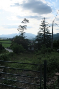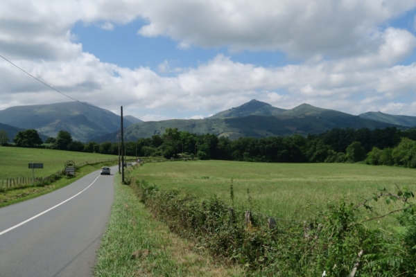 Ja der Hänger ist leichter und gleich die ersten Berge nehmen wir ohne Murren. Bonny habe ich an dem Fahrradtrailer angeleint. Er muss morgens gleich laufen, sonst murrt er hinten immer im Hänger. Es ist zwar Verkehr, aber die 933 hat einen breiten Seitenstreifen, der uns fast ganz aufnimmt. Die Gegend wirkt anders – eigentlich schon gestern – keine Grillen mehr, die die Musik in der Umgebung beherrschen, vielmehr ab und zu sogar einige Singvögel. Aufwärts immer aufwärts schlängelt sich die Straße am Fluss Nive entlang. Dann ist eine Hochebene erreicht, wo die Steigung nachläßt eher mäßig weiterführt. Bonny ist jetzt 15km gelaufen und sie freut sich auf den Hänger – vorher natürlich noch mit Wasser versorgt – der Fluss ist ja gleich daneben.