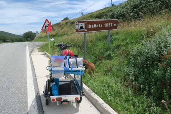 Madame & Monsieur SARZI Walter laden mich zu einem Café im Wohnmobil ein. Obwohl wir uns in keiner Fremdsprache treffen können unterhalten wir uns prächtig über Urlaubsziele, Alter und was die Welt so bewegt. Am Schluss stelle ich noch fest, nachdem ich ihre Karte in der Hand halte, dass sie aus NIMES sind und verspreche vorbeizuschauen – vielleicht mit Rosalie, wenn wir in Saint Laurent sind. Dann springe ich aufs Rad um die letzten 3,8 km zu schaffen. Schon die ersten Meter höre ich das Geräusch am Vorderrad – der Motor bringt 0 Leistung – er rattert aber zieht nicht. Himmel oder Jakobus oder sonst wer hilft nicht – er ist kaputt. Hatte ich doch noch vor 2 km den Fahrrad Akku gewechselt, um volle Leistung zu haben. Ich schalte runter und versuche es mit Beinkraft – Schmerz durchzuckt die Muskeln aber es geht. Die 3 KM wirst du noch schaffen trotz ungefähr 9% Steigung. Aber mitnichten, der Akku des Hängers ist auch leer. Noch 2,2km – ich wechsele den Akku und trete weiter rein.