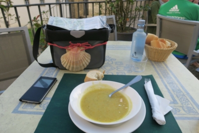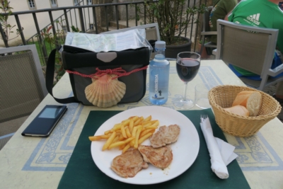 Bonny findet sich gleich zurecht und er wird überall mit – ach was für ein toller Hund empfangen. Das Gebäude ist sehr groß, neu hergerichtet und voll auf die Pilger ausgerichtet. Es gibt aber außerdem auch ein ****Sterne Hotel mit Restaurant. Nachdem ich meinen Stempel habe und den Obolus von 3€ entrichtet habe, baue ich auf und dusche erstmal ausgiebig – doch alles etwas verschwitzt. Auf der Terrasse kann ich das Pilgermenü bestellen, denn dort darf Bonny hin. mmmhhhh hat geschmeckt – ich hatte allerdings auch länger nicht Warmes.