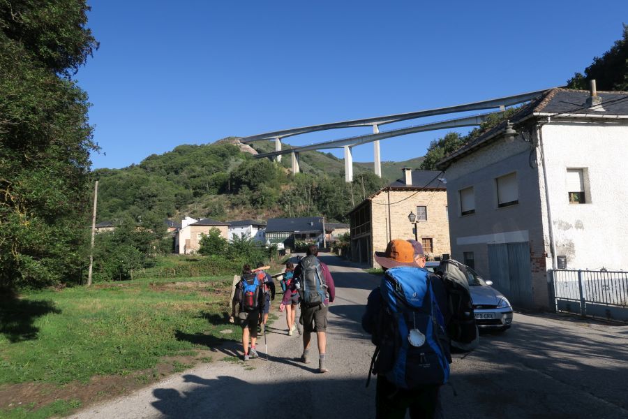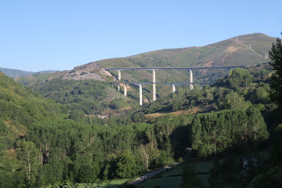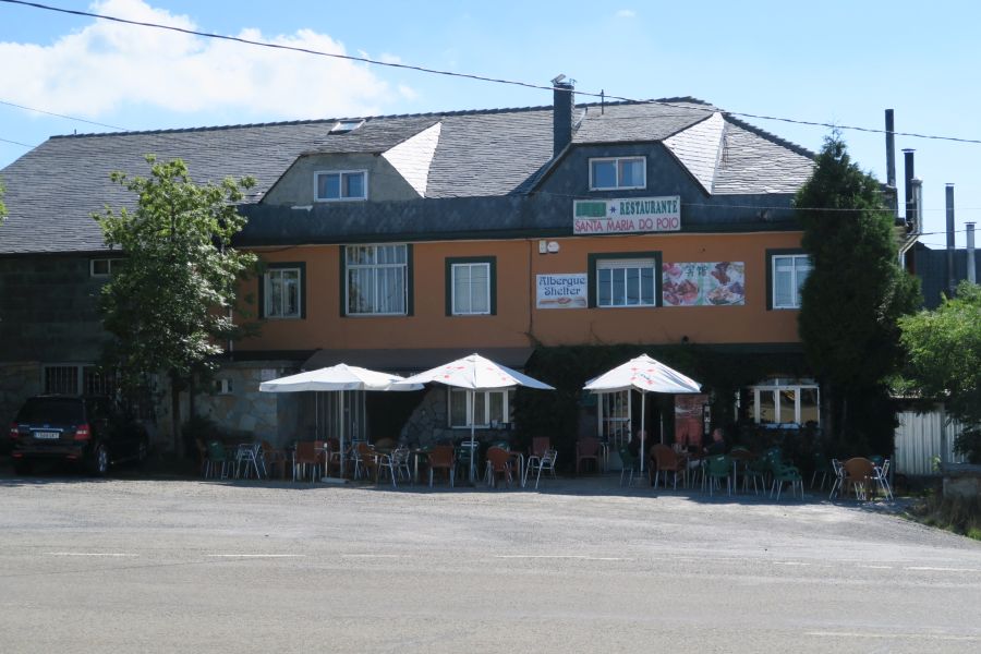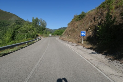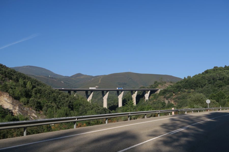 Hier oben beginnt der Tag erst etwas später. Die Sonne kraxelt wie die Pilger die Berge hoch, um auch hier ihre Wärme zu verteilen – es ist 7:45 Uhr und gerade mal 9°. Trotzdem ist schon alles lebendig in dem Hotel – die Pilger gehen schon los, die Radpilger frühstücken noch und die Fernfahrer tauchen erst langsam in der Bar auf. Hier heißt alles Bar, auch wenn das Frühstück gereicht wird. Frühstück: Cafe und ein Stück Kuchen oder 2 Toast mit Butter und Marmelade.