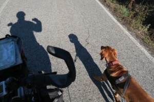ich will bis Samos runterfahren, das sind noch 29 km, die müßte ich noch schaffen, um den nächsten Campingplatz zu erreichen – nach einer Stunde fällt mir ein, du kannst ja auch hier mal fragen, ob der Hund akzeptiert wird und eine Garage mit Strom da ist – ja – sie haben selber einen Hund im Haus und beide freunden sich an – Hund kein Problem mehr – er darf sogar mit aufs Zimmer und die Garage hat alles was ich brauche.