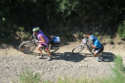 So kann ich in Ruhe die Pilger beobachten, die auf dem original Camino hier hoch steigen – gefolgt von den Mountainbikern, die auch nur schiebend hier hoch kommen….