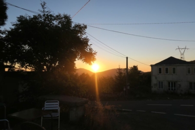 Hier oben beginnt der Tag erst etwas später. Die Sonne kraxelt wie die Pilger die Berge hoch, um auch hier ihre Wärme zu verteilen – es ist 7:45 Uhr und gerade mal 9°. Trotzdem ist schon alles lebendig in dem Hotel – die Pilger gehen schon los, die Radpilger frühstücken noch und die Fernfahrer tauchen erst langsam in der Bar auf. Hier heißt alles Bar, auch wenn das Frühstück gereicht wird. Frühstück: Cafe und ein Stück Kuchen oder 2 Toast mit Butter und Marmelade.